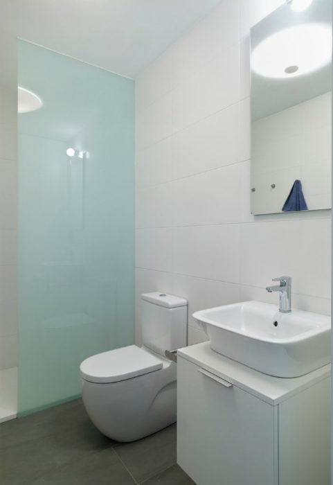 Baños: paredes recubiertas con porcelanato, sanitarios y grifería F.V.