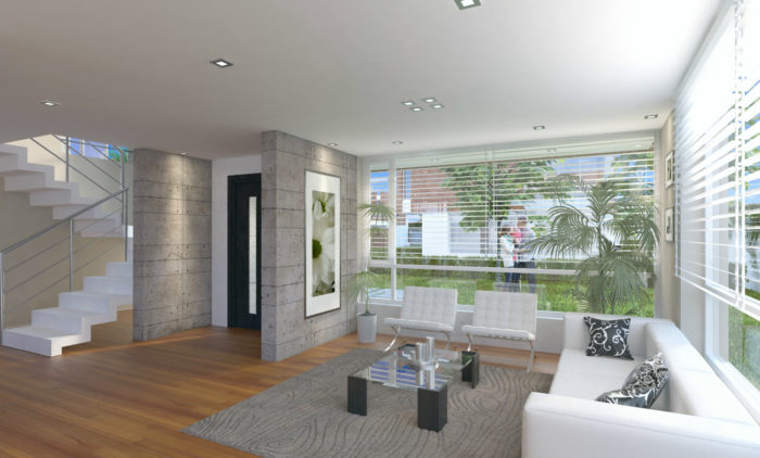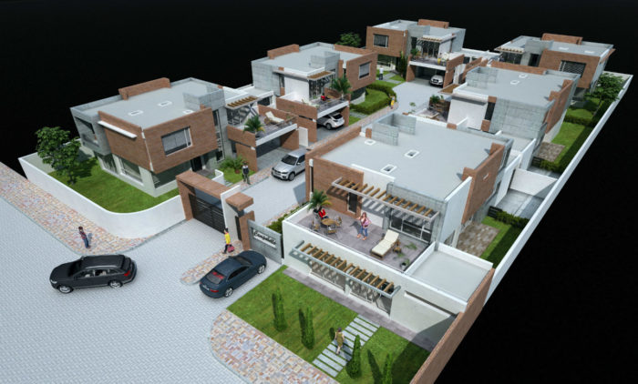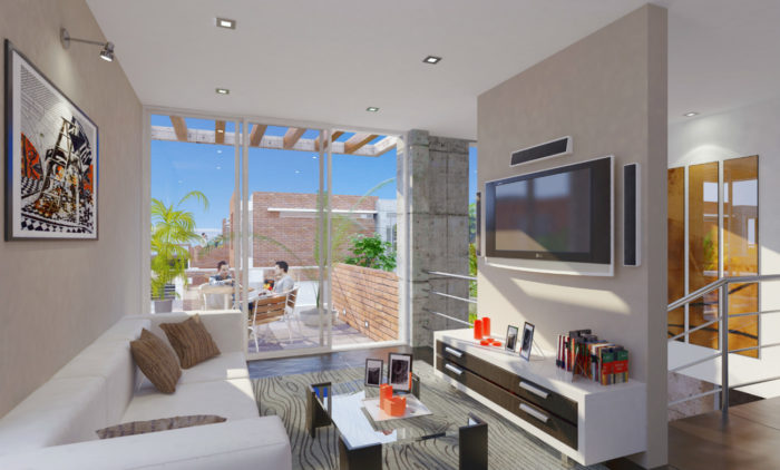 Conformado por sala, comedor, cocina, baño social, estudio, bodega, dos parqueaderos cubiertos, áreas verdes, patio de servicio, terraza del comedor.